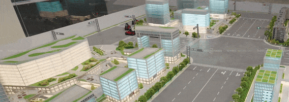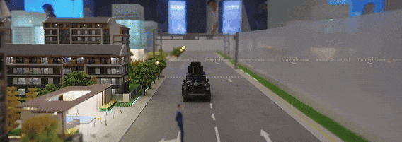 具象化呈现了繁华市区、工业园区、生活社区中,车辆与道路设施、行人,通过智能网联汽车技术实现的通行效率、便利性提升与安全保障。