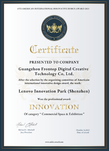 凡拓数创项目 联想南方基地工厂展厅 荣获 2023美国国际创新设计大奖——创新设计奖。