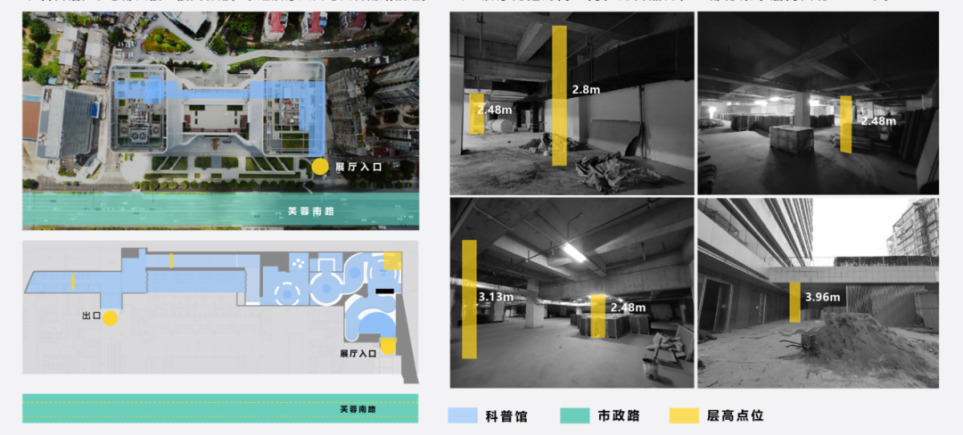 爱尔眼科眼健康科普中心位于总部大楼一楼,展厅内部为封闭空间,几乎没有自然光,且部分梁下层高只有2.48米,场地条件限制较大。