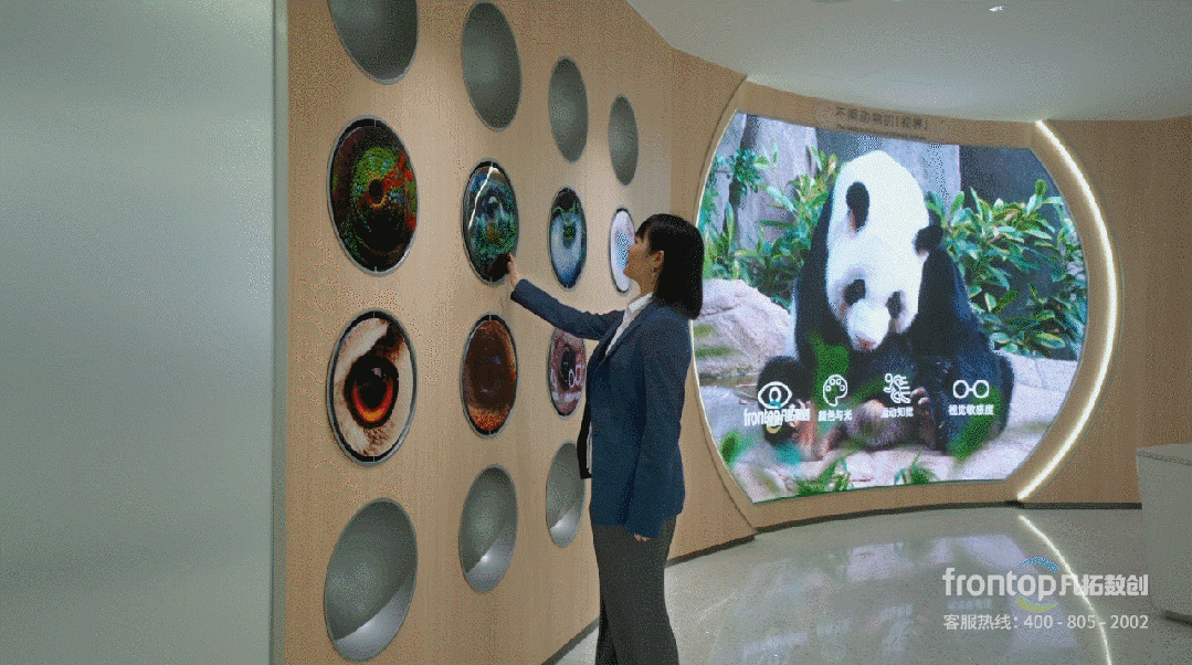 利用手势交互体验游戏,展示对比人类与马、鹰、蜂鸟、青蛙、蜥蜴、猫等不同动物的成像“视界”,让参观者在互动中学习不同物种如何运用自己的眼睛认识世界。