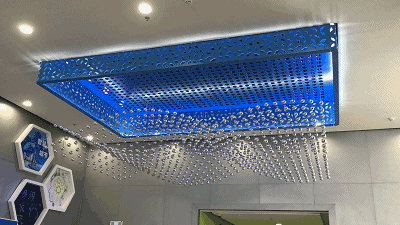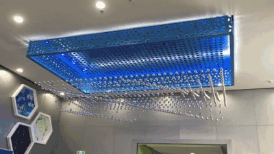 蓝色吊顶下,悬挂着一组由792个小球构件组成的音乐球阵。伴随着绚丽的音乐和灯光,小球构件将在计算机的控制下进行上下移动,演示出100多个动态造型。