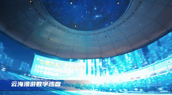 云海漫游区域,大型多媒体数字沙盘围合成沉浸式数字影院,以震撼的光影秀开场,三维影像叙述白云区产业规划的恢弘篇章。