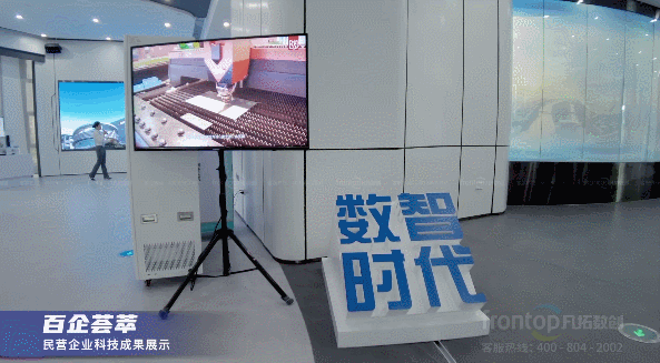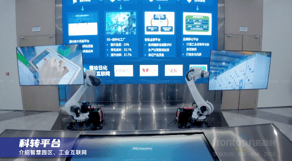 观众可通过触摸一体机操控LED屏幕上宣传片的播放,与此同时启动机械臂掌控55寸屏灵活拼接、旋转,展示工业互联网在白云区的应用场景以及园区先进龙头企业的科研成果。