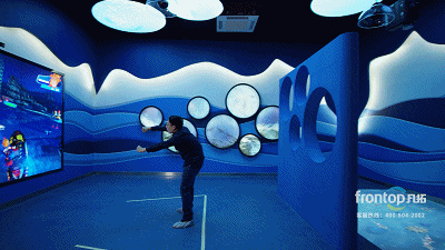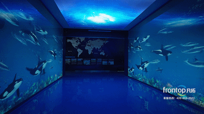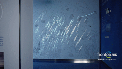 地幕投影画面设置为鱼儿畅游、海草摆动的海底场景,参观者通过感应系统踩踏互动地面,会在脚底生成水纹、驱赶鱼群、冒水泡的互动特效。