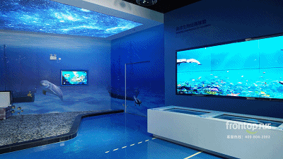 模拟还原逼真的海底景象,游动的鱼群、水草飘动及珊瑚成群等影像投影,让参观者仿佛置身海洋世界。