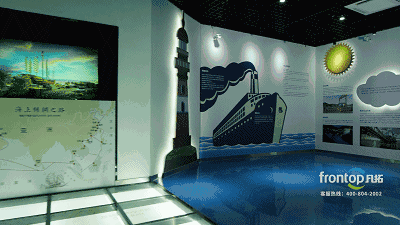 结合动态影像特效与音效,呈现动态海潮洋流影像,意为引导游客前行,一段精彩的海洋体验旅程到此结束。