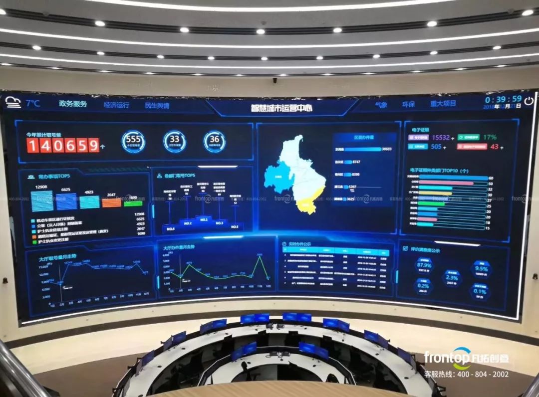 数控多屏联动系统通过大数据信息柱形象呈现连云港智慧政务建设成果。未来“只进一个门”就能轻松解决政、企、民三者间的政务交流互动。